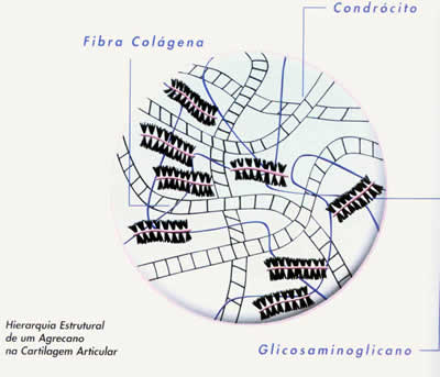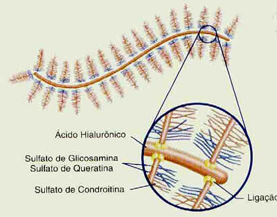 Os proteoglicanos são macromoléculas formadas por uma proteína central onde estão ancoradas numerosas cadeias de glicosominoglícanos formadas por unidades repetitivas de dissacarideos (ácido úrico e hexosamina). O proteoglicano predominante na cartilagem articular é o agrecano e os glicosaminoglicanos que compõem os suas cadeias laterais são formados par sulfato de condroitina e sulfata de queratan. Os agrecanos possuem grande capacidade de reter moléculas de água e conferem a cartilagem a habilidade de sofrer deformação reversível resistindo, portanto, à compressão.