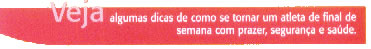 Exercitar-se e cuidar da alimentação são cuidados simples que garantem a saúde do corpo e da mente. Com moderação, consciência e respeito a si mesmo a atividade física só trará benefícios não apenas para a saúde, mas também para a vida profissional e social. Com o tempo e a prática, o exercício pode se tornar um grande prazer. E para quem deseja sair do sedentarismo e entrar para o rol de atletas de final de semana, seguem algumas instruções: